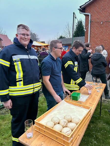Mit Stockbrot für die Kinder, Mixis und Bier für die Erwachsenen in der Fahrzeughalle, und Pommes und Bratwurst und alkoholfreien Getränken für alle, war für jeden kulinarisch gesorgt. So konnte das Osterfeuer pünktlich um 20 Uhr durch Harald Kruse angesteckt werden.
